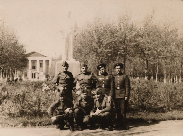 Вот такими был вход в парк. В парке стояли огромные вазы для цветов. Вечерами играл духовой оркестр, на заасфальтированной танцплощадке танцевали счастливые люди. На фото 1975года – офицеры и прапорщики войсковой части 11291 после праздничных мероприятий в честь 30-летия Победы над фашистской Германией в Великой Отечественной войне 1941—1945 г.– майор М. А. Ходюк, майор Н. А. Ковалёв, майор К. И. Гаврилов, прапорщики С. Коляко, А. Хлудов, В. Матвеев, В. Клочков.