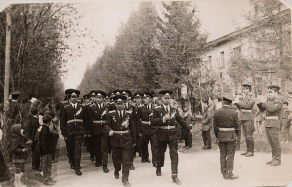 На фото 1965 г. офицеры в/ч 11291 (ОСЧ). Вверху: слева направо Щербенёв (второй), Корсаков (третий), Титаренко (шестой), Сапрыкин (седьмой), Лебедев (восьмой). В середине: Грайко, Перевозник, Левченко, Лейн Внизу: Алексеев (первый), Чернецов (второй)