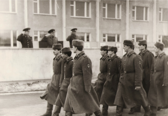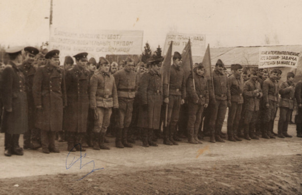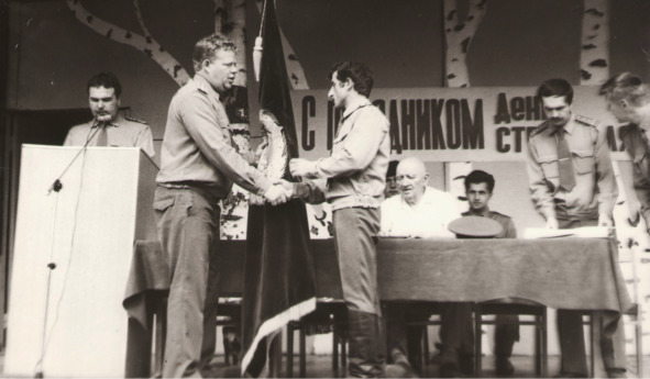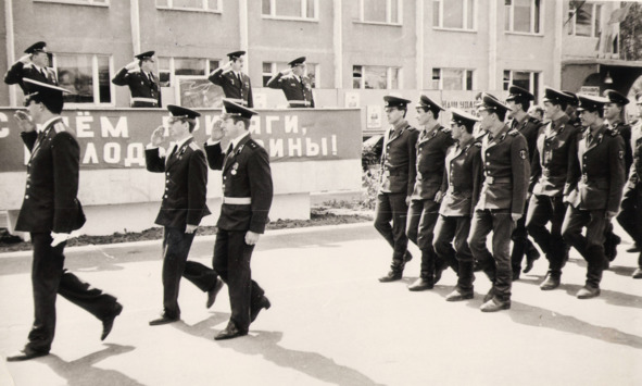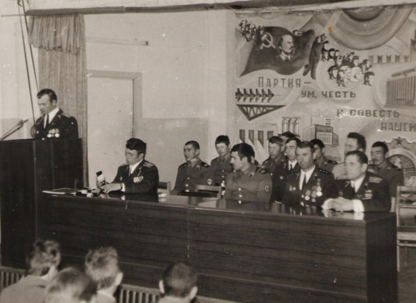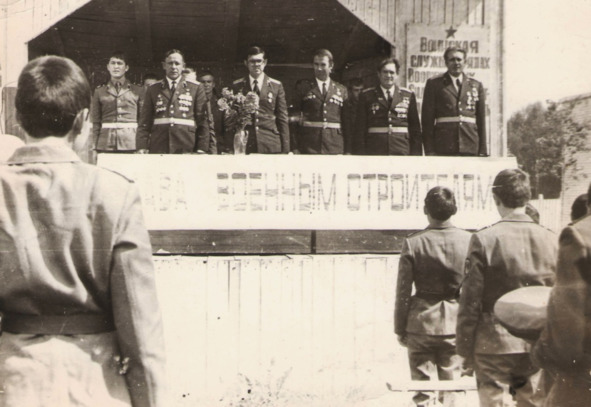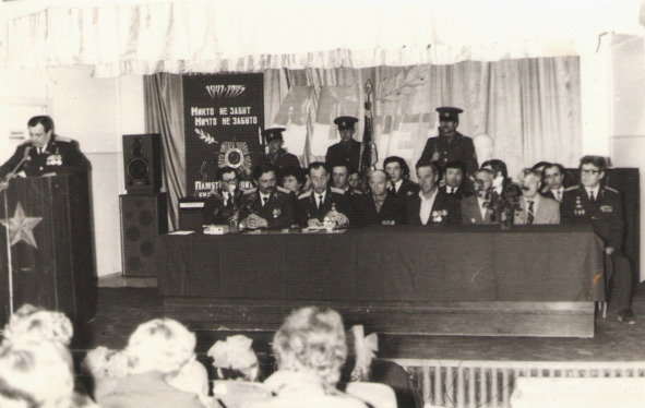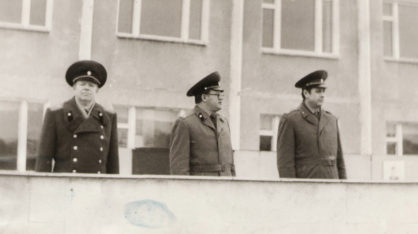 1 мая 1983 г. торжественное собрание части. На трибуне командир части Журавлёв Александр Михайлович Сидят за трибуной слева направо- нач. штаба Костин В., секретарь комсомольской организации части прапорщик Кирепко Николай, Козяр С. Д., зам. по тылу Барков Василий Константинович