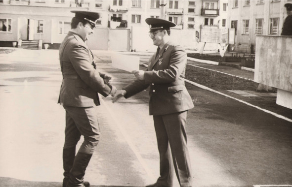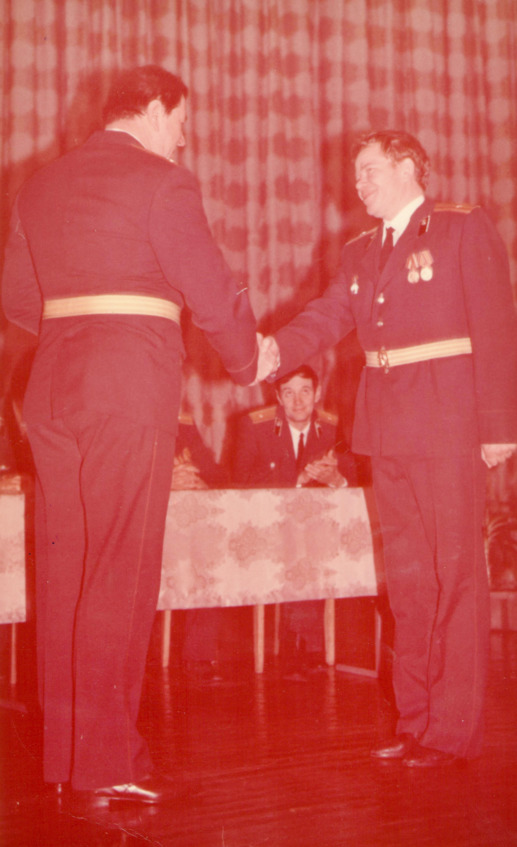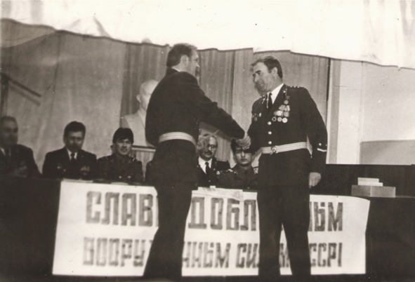 Командир части подполковник Бигус Анатолий Леонтиевич награждает ст. прапорщика Козяр Сергея Денисовича в честь дня Советской Армии за высокие результаты в служебной деятельности. 23.02.1987 г.