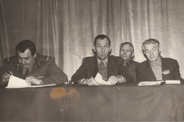 Евгений Александрович Шумаев вручает награду Щепалкину Василию Андреевичу, 23.2.1990 г. За столом президиума