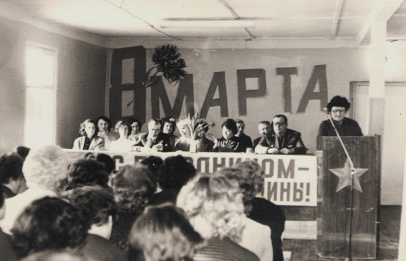 Минеев Виктор Владимирович (слева от трибуны). Поздравление женщин комбината с праздником. 8 марта 1984 г.