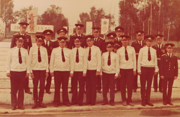 Офицеры и прапорщики части, конец 80-х г. Первый ряд; Орлов, не знаю, Щепалкин, Акуленко, Смирнов, Салманов, Лазаренко, не знаю, Кирсанов. Второй ряд: Мишустин, Комаров, Кайдалов, Круговой, не знаю, Севян, Полянский, Ушаков, Пьянков. (комментарии к фото – Василия Хлопко)