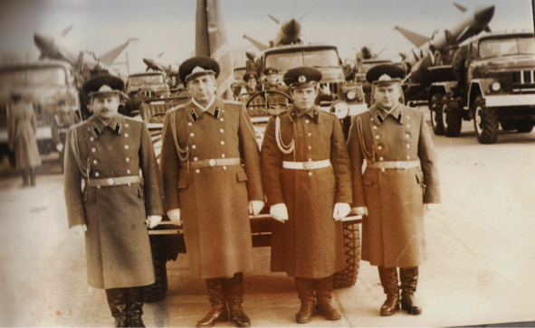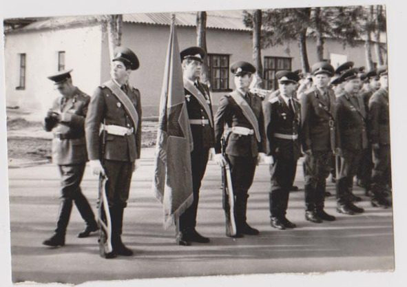 Сержант Груздев В,, знаменосец и лучший строевик части майор Безлепкин В., сержант Афанасьев В., майор Шимиев В., майор Клапчук В., майор Кошелев Е. на строевом смотре. 1984 г.