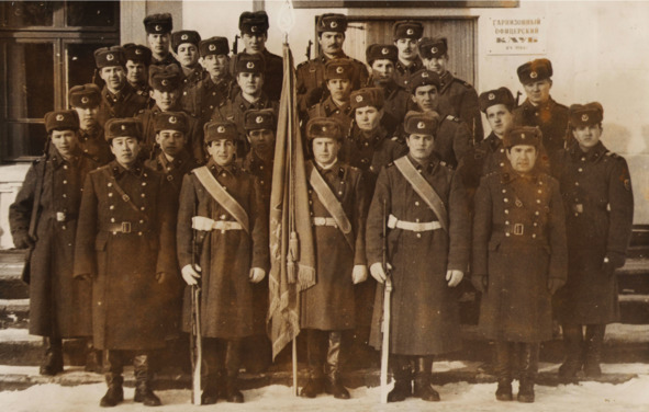 Первый ряд – нач. штаба П. Зайцев, зам. по тылу М. Синицын, гл. инженер А. Горскин,.?, командир Г. Шушко (в гр.), нач. политотдела В. Беляков, командир Пустеленин, нач. политотдела В. Красиков.