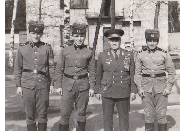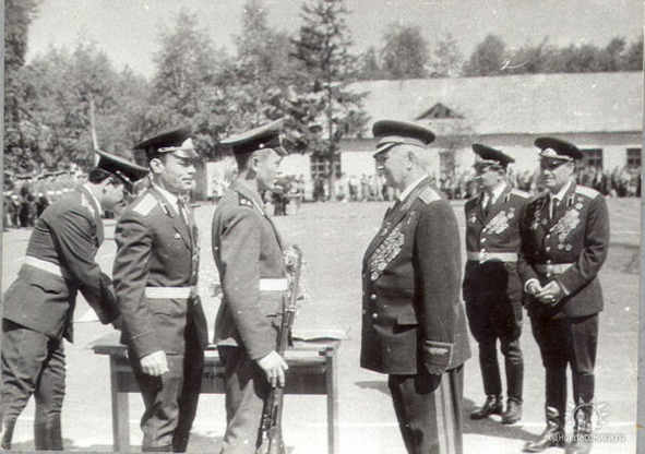 Молодого солдата из подразделения П. И. Гриценко рядового Анисимова поздравляет с принятием воинской присяги генерал – майор Е. В. Соколовский (сын Машала Советского Союза В. Д. Соколовского). На заднем плане командир в/ч 52147 Г. И. Шушко, начальник политотдела полковник Н. М. Шаповалов. Слева – В. В. Забродин