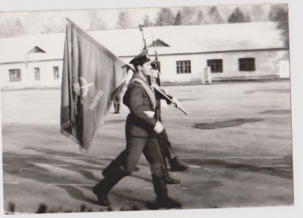 Знаменосцы сержант Груздев Владимир и сержант Афанасьев Виталий с гордостью проносят знамя войсковой части 52147. 1984 год.