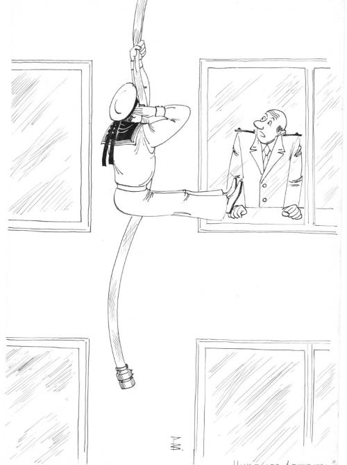 Офицер, по инерции тоже отдал честь и тут же спохватившись, бросился наверх, причем, в большей степени испугавшись за безопасность курсанта. Когда он вбежал на четвертый этаж, то застал только развернутый по коридору пожарный шланг и стоящего по стойке смирно дневального. Окно было закрыто. Капитан 3 ранга подбежал к дневальному с вопросом: “Где самовольщик?”