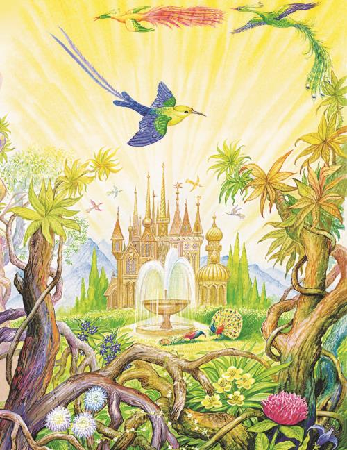 Сходит он по другой лестнице из мрамора зелёного, из малахита медного, с перилами позолоченными, сходит прямо в зелены сады. Гуляет он и любуется: на деревьях висят плоды спелые, румяные, сами в рот так и просятся, инда, глядя на них, слюнки текут; цветы цветут распрекрасные, махровые, пахучие, всякими красками расписанные; птицы летают невиданные: словно по бархату зелёному и пунцовому золотом и серебром выложенные, песни поют райские; фонтаны воды бьют высокие, инда глядеть на их вышину – голова запрокидывается; и бегут и шумят ключи родниковые по колодам хрустальным.