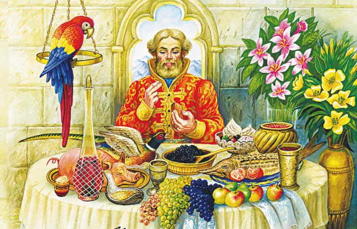 Ввечеру гости понаехали, и стал дом у купца полнёхонек дорогих гостей, сродников, угодников, прихлебателей. До полуночи беседа продолжалася, и таков был вечерний пир, какого честной купец у себя в дому не видывал, и откуда что бралось, не мог догадаться он, да и все тому дивовалися: и посуды золотой-серебряной, и кушаний диковинных, каких никогда в дому не видывали.