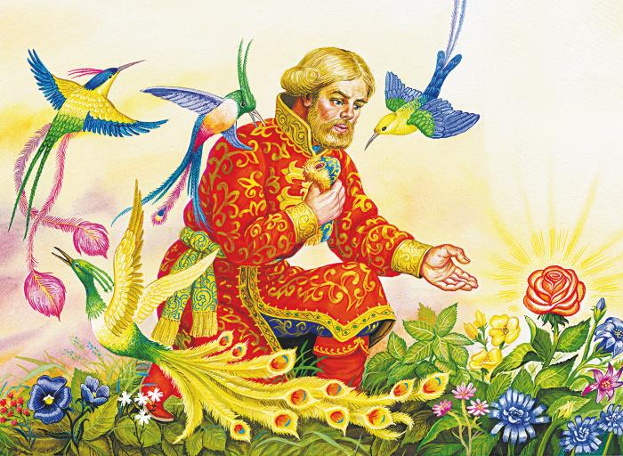 Ходит честной купец, дивуется; на все такие диковинки глаза у него разбежалися, и не знает он, на что смотреть и кого слушать. Ходил он так много ли, мало ли времени – неведомо: скоро сказка сказывается, не скоро дело делается. И вдруг видит он, на пригорочке зелёном цветёт цветок цвету алого, красоты невиданной и неслыханной, что ни в сказке сказать, ни пером написать. У честного купца дух занимается; подходит он ко тому цветку; запах от цветка по всему саду ровно струя бежит; затряслись и руки и ноги у купца, и возговорил он голосом радостным: