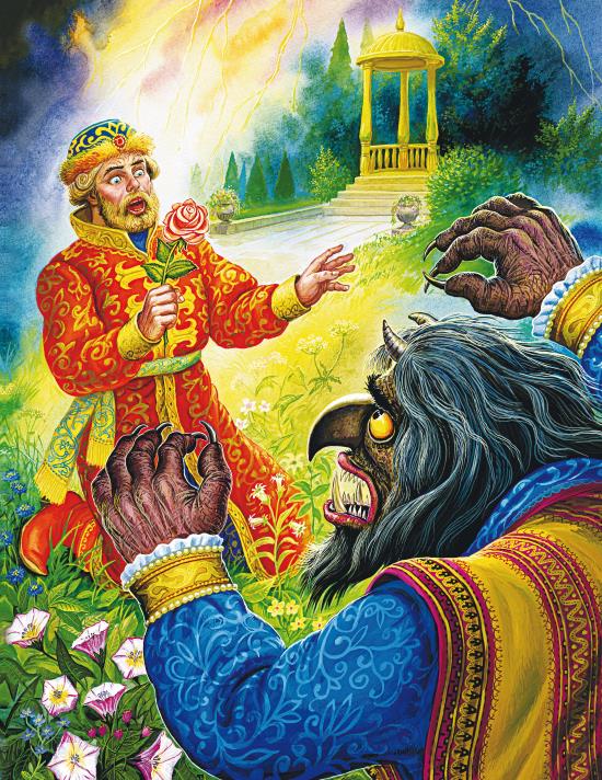 – Не надо мне твоей золотой казны: мне своей девать некуда. Нет тебе от меня никакой милости, разорвут тебя мои слуги верные на куски, на части мелкие. Есть одно для тебя спасенье. Я отпущу тебя домой невредимого, награжу казной несчётною, подарю цветочек аленький, коли дашь ты мне слово честное купецкое и запись своей руки, что пришлёшь заместо себя одну из дочерей своих, хороших, пригожих; я обиды ей никакой не сделаю, а и будет она жить у меня в чести и приволье, как сам ты жил во дворце моём. Стало скучно мне жить одному, и хочу я залучить себе товарища.