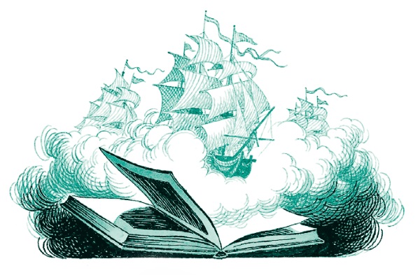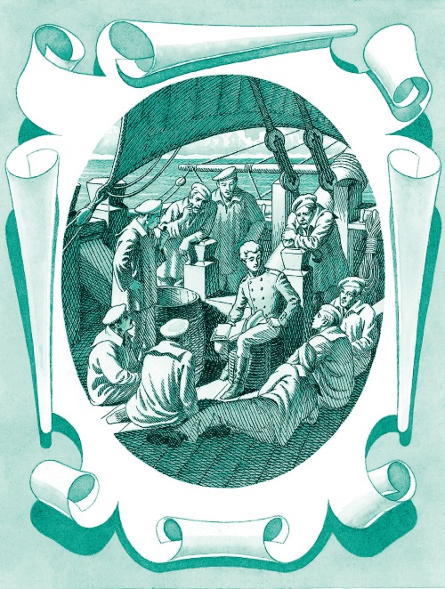 И вот ходко бежит корабль в открытом море. Поскрипывают снасти, плещутся волны под высокими бортами. Свободные от вахты матросы собрались на баке вокруг бочки с песком – туда они стряхивают пепел из своих коротких трубок. На пустом бочонке устраивается поудобнее безусый еще гардемарин, открывает книгу и начинает читать…