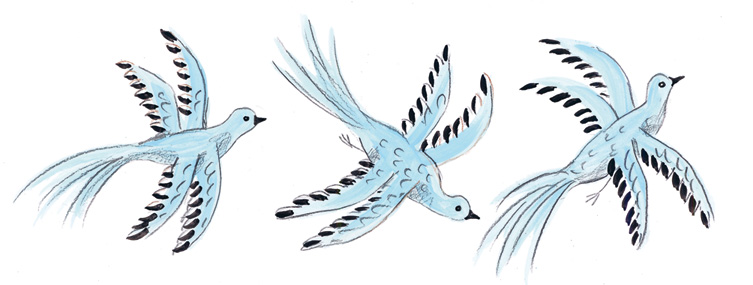 А птицы были не простые. У каждой птицы по четыре крыла. В каждом крыле по семи перьев. Каждое перо тоже со своим именем. Одна половина пера белая, другая – чёрная. Махнёт птица раз – станет светлым-светло, махнёт другой – станет темным-темно.