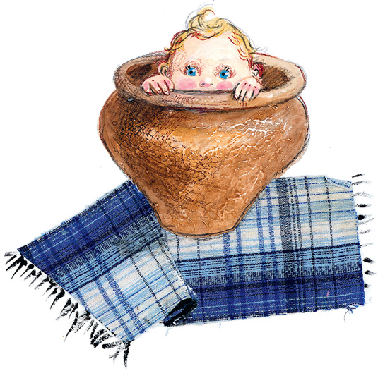 Однако старик принёс комочек снегу в избу, положил в горшочек, накрыл ветошкой[1] и поставил на окошко. Взошло солнышко, пригрело горшочек, и снег стал таять. Вот и слышат старики – пищит что-то в горшочке под ветошкой; они к окну – глядь, а в горшочке лежит девочка, беленькая, как снежок, и кругленькая, как комок, и говорит им:
