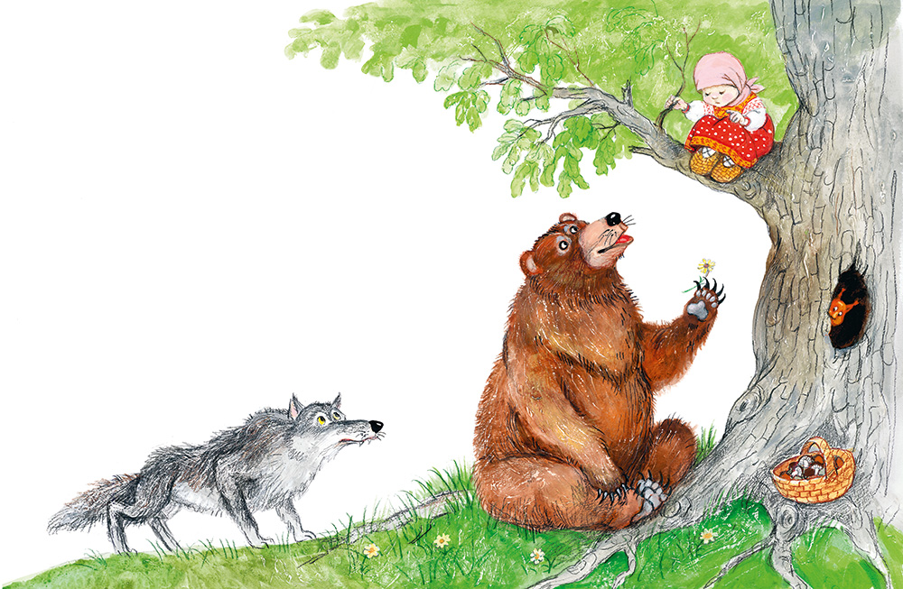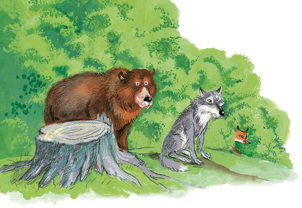 Стоит медведь за пнём, волк на прогалине, лиса по кустам шныряет.