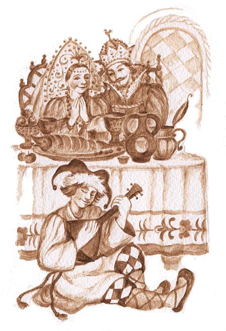 Иван был провозглашен от народа царем земли той, а супруга его, благоверная Катерина, царевною; он был еще в цветущей молодости своей, да и она в отсутствие его не состарилась, ибо все неимоверные похождения его с Котышем-Наха-лом и гуслями-самогудами действительно произошли в продолжение одних только суток. Царь Иван много лет здравствовал и царствовал кротко и смиренно, милостиво и справедливо; пользовался мудрыми советами супруги своей, благоверной Катерины, ратию своею несметною держал во страхе и повиновении врагов своих, и был благословляем народом. Празднуя же восшествие свое и супруги своей на престол, заставил на пиршестве обильно ликовать народ три дня и три ночи без отдыха; вина заморские лились через край; яств, каких только прихотливая душа твоя пожелает, вдоволь; скоморохи, выписные и доморощенные, игрища многоразличные, горы, пляски, салазки и сказки, кулачные бои увеселяли народ, со всех концов царства обширного собравшийся.