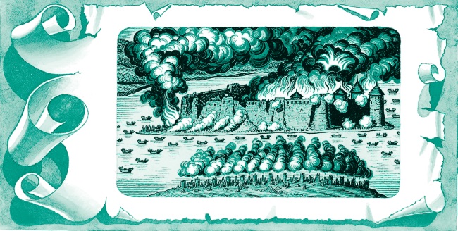 Войско наше дошло левым берегом, а пятьдесят судов, которым нельзя было пройти мимо крепости, перетащены были переволоком, по просеке, из Ладожского озера в Неву; они переправились ниже крепости на правый берег и перевезли туда орудия и войско. Стали сильно обстреливать крепость с обоих берегов. Царь был день и ночь на своей батарее, управлял, учил, наводил орудия и стрелял своими руками. В десять дней сделали три пролома; охотников перевезли в лодках на остров, к крепости, и они пошли на приступ; шведы отбили их; на помощь было послано еще два гвардейских полка, с лестницами, но лестницы были не в меру коротки, и шведы били наших, которые лезли очертя голову. Видя это, государь отослал с берега приказание через поручика от бомбардир Меншикова, не лучше ли отступить, но князь Голицын, начальник приступа, видя, что неприятель много потерял и слабеет, отдал громко приказание, чтоб лодки отвалили от острова, сказав: «Либо все ляжем здесь, либо русское знамя поставим!»