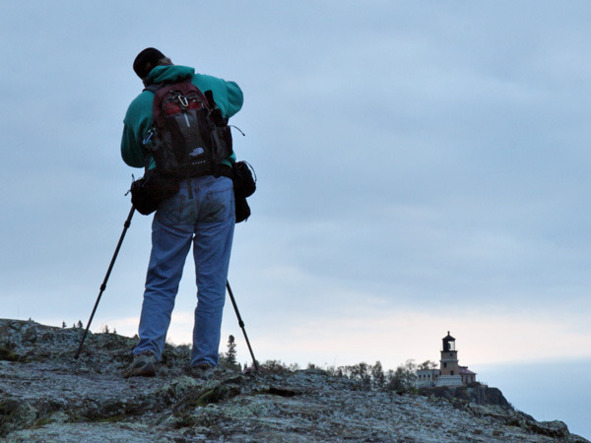 Это было ранним утром на Верхнем Озере на маленьком каменистом островке, куда можно было добраться по скользким камням, балансирую штативом и камерой. Я увязался за профессиональным фотографом, который хотел снять маяк на фоне утреннего неба. Пощелкав окрестности, я решил сделать кадр с самим фотографом, которым снимает маяк. Маяк был на берегу, за проливом, примерно в километре от нас. Фотограф был очень близко, и я все свои умственные способности направил на решение задачи о глубине резкости. Мне надо было, чтобы фотограф и маяк получились резкими.