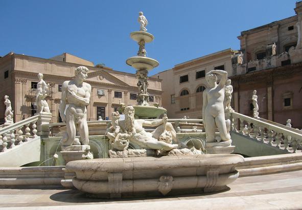 Когда беседа с первыми парнями Палермо была закончена, я еще раз посмотрел на фонтан. Если честно, то внимательно посмотрев на фонтан, дальше лучше никуда не ходить, чтобы не растерять впечатление. Фонтан красив не только сам по себе, но и своим окружением. Дома-дворцы на заднем плане создавали впечатление, что фонтан находится на сцене древнего театра, а мраморные фигуры – это артисты, ненадолго присевшие отдохнуть и поплескаться в прохладной воде. Завтра мы еще сюда вернемся. Такое у нас бывает редко, обычно мы несемся только вперед, не оглядываясь.
