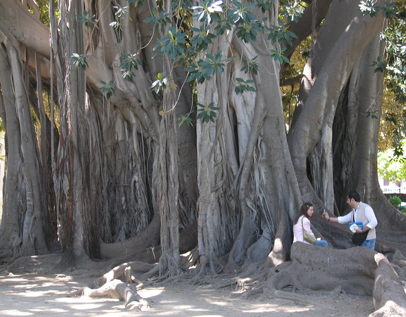 Силы на исходе, сделали марш-бросок к Морской площади, к ее знаменитому саду с древними магнолиями. Магнолии огромные, таких я никогда не видел. Корни выпирали из земли, каждое дерево образовывало небольшую рощицу. Казалось, что ветви растут прямо из корней. Под деревьями тень, прохлада. На корнях сидели пожилые сицилийцы, а влюбленные фотографировали друг друга. Раньше тут проходили публичные казни, сейчас место отдыха. Да, вот она Сицилия! В саду время почти остановилось, в воздухе разлита лень и нега. Мысли текут в правильном направлении: где мы будем обедать?