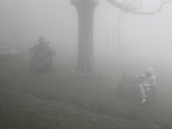К нам в гости пришло облако. Сначала за окном замелькали белые клочья – щупальца облака. А потом пришло и само облако, похожее на туман. Но это живой туман. Он двигался, менял цвета, закрывал и открывал окружающие деревья и тропинки. Мы вышли из дома и пошли через лес к бассейну. Там облако заползло под крышу и чувствовало себя весьма комфортно, получая подкрепление от испарений бассейна-спа. Окружающий мир стал совсем сюрреалистическим. Казалось, что скульптуры стариков, сидящих на скамейке и играющих на альте, ожили, в воздухе явно слышались звуки музыки, над бассейном появлялись и исчезали призрачные фигуры, слепленные из тумана.