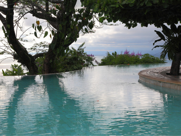 Но бассейн в отеле Марипоза (бабочка) уникален. Он огромен, извилист, над ним растут красивые деревья, на которых поют птицы, от него не пахнет хлоркой и еще он infinity view. Последнее означает, что когда плывешь по бассейну, то кажется, что плывешь в бесконечном море без бортиков-берегов.