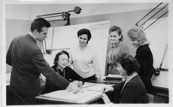 Мама работала в конструкторском бюро у С. П. Королёва. Перед 8-м марта к ним в отдел пришел фотограф – его пригласили мужчины, такой они придумали подарок к празднику. Женщин расставили вокруг стола на фоне кульманов и попросили улыбаться, оставаясь серьезными.