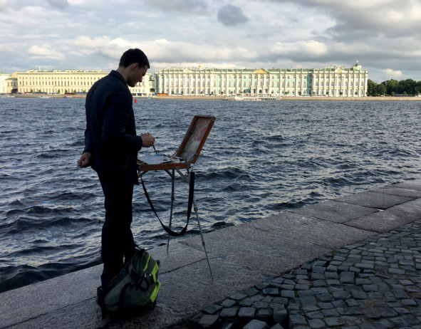 На стрелке Васильевского острова художник рисует серую Неву и Зимний дворец. Каждый проходящий заглядывает ему через плечо. Художник не реагирует. Хочу сделать фотографию и назвать её «Одиночество в толпе».