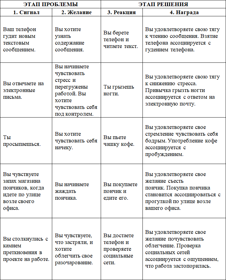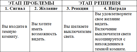 Этот четырехшаговый шаблон лежит в основе каждой привычки и ваш мозг каждый раз выполняет эти шаги в одном и том же порядке. (13)