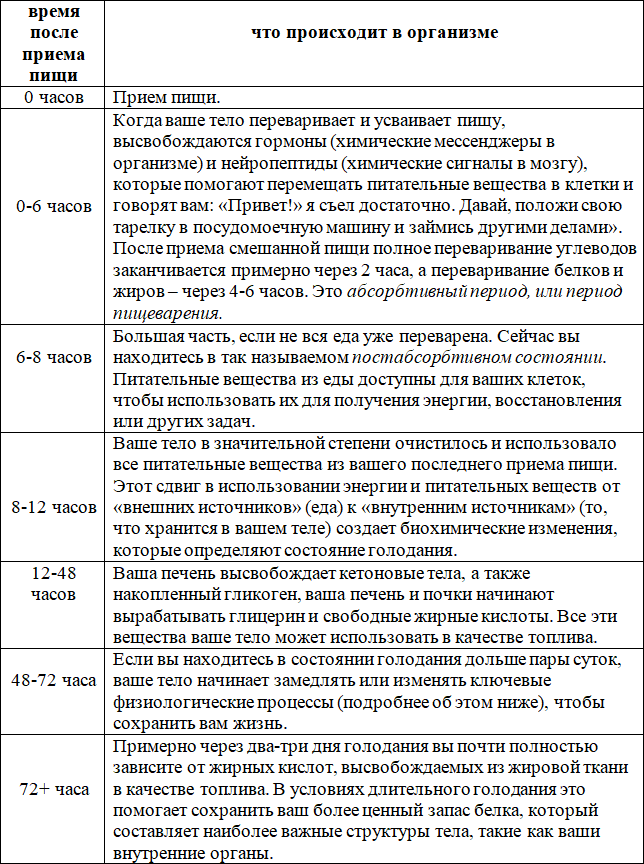 – «голодание» – это метаболическое состояние, в которое организм входит через 8–12 часов без приема пищи. Это определяется переходом в использовании питательных веществ от «внешних» к «внутренним» источникам. Именно этот сдвиг создает биохимические изменения и потенциальные преимущества голодания. (4)