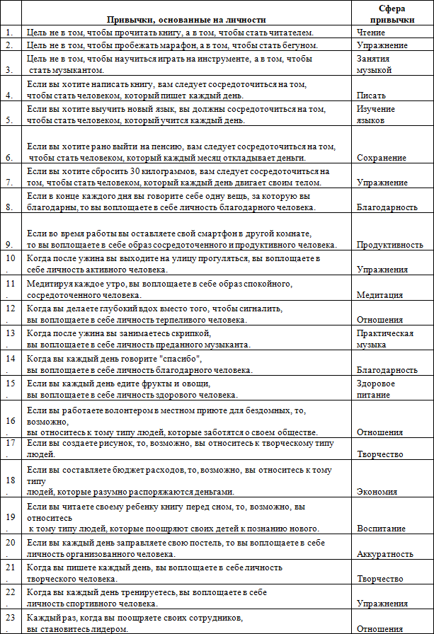 Итак, это первый урок: подумайте о своей желаемой личности и спросите: «Кто тот тип человека, который может добиться желаемого результата?» Что бы сделал здоровый человек? Что бы сделал продуктивный человек? Что бы сделал Х? Эти вопросы помогут выявить желаемую личность, над которой вам следует работать, и привычки, которые поддерживают эту личность. Так вы сможете определить, на какой привычке вам следует сосредоточиться.