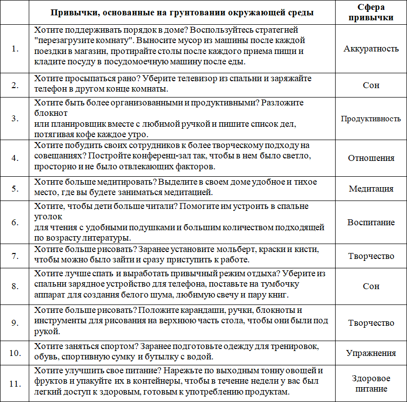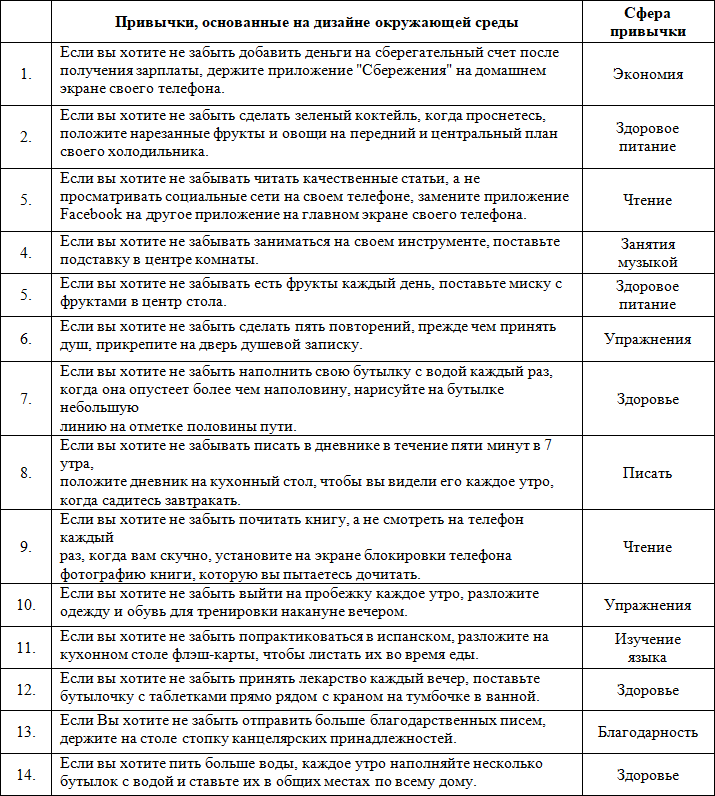 Но и это важная часть, помня о наших целях, мы можем сознательно использовать нашу силу воли, чтобы манипулировать окружающей средой и вырабатывать желаемые привычные реакции на сигналы по нашему выбору. Таким образом, мы можем ежедневно использовать нашу среду для развития автоматического, привычного поведения, которое поможет нам достичь наших целей.