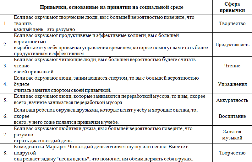 Обычаи, социальная атмосфера и другие условия, в которых воспитывается человек, образуют социальную среду, определяющую набор или структуру личных привычек.