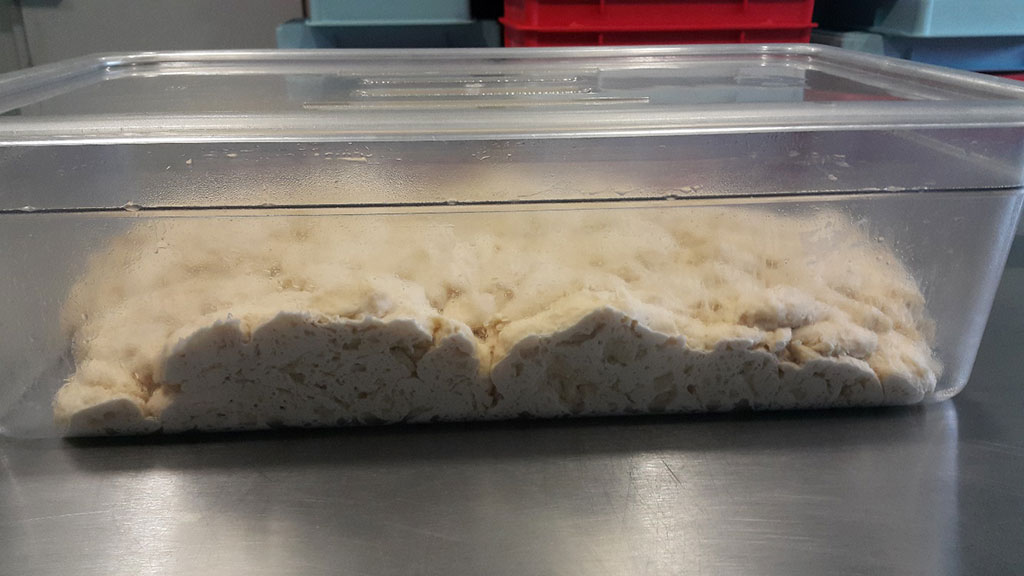 5. После окончания замешивания теста перекладываете его в подготовленный контейнер, накрываете крышкой, ставите маркировку (наименование, дату и время приготовления, дату и время окончания срока, кто готовил) и оставляете в помещении на 16–18 часов при температуре от 20 до 25°С.