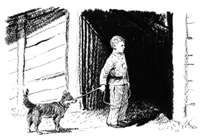 Я накинул Жучке на шею верёвку и повёл в сарай. Жучка весело бежала, натягивая верёвку и оглядываясь. В сарае было темно. Дрожащими пальцами я нащупал над головой толстую поперечную балку; потом размахнулся, перекинул верёвку через балку и стал тянуть.