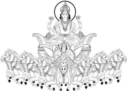 Ашвины стали богами сумерек и утренней и вечерней звезд. Перед самым рассветом, когда на исходе ночи свет борется с тьмой, они первыми из богов появляются на утреннем небе, двое могучих витязей, вечно юные и прекрасные, на золотой колеснице, влекомой крылатыми конями. Вместе с ними на колеснице едет их подруга, солнечная дева Сурья[52], дочь Савитара. Когда-то отец назначил ей быть женой Сомы, бога луны, но руки прекрасной девы домогались многие боги, и было решено, что ее получит тот, кто в беге на колесницах первым доскачет до солнца. В этом состязании первыми достигли солнца Ашвины, и светлая Сурья взошла на их колесницу и стала их спутницей.