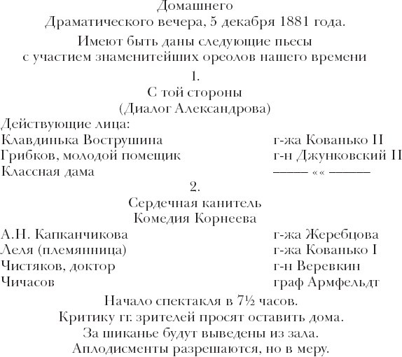 В декабре месяце, в день рождения моей старшей сестры, мы устроили дома спектакль. Это был для нее сюрприз, она и не подозревала, что мы ей готовили такой праздник. Я играл молодого помещика, влюбившегося в барышню, дочь соседа по имению. Мой брат и младшая сестра играли во французской пьесе. Привожу программу: