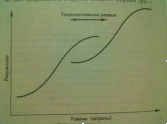 В зоне перехода от одной S-образной к другой S-образной образовывается разрыв. Р.Фостер называет это «технологическим разрывом». Это есть время хаоса, неопределенности, время борьбы старого и нового.