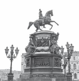 В центре Исаакиевской площади установлен великолепный памятник Николаю I, правившему в 1825–1855 гг., спроектированный архитектором Огюстом Монферраном в 1856 г. Мастер конной скульптуры Петр Карлович Клодт изобразил императора в мундире конногвардейского полка. Каска, увенчанная двуглавым орлом, надвинута на глаза. Высокие сапоги-ботфорты и палаш на боку дополняют образ тщеславного, жестокого монарха, завершившего свое правление провальной Крымской войной (1853–1856).
