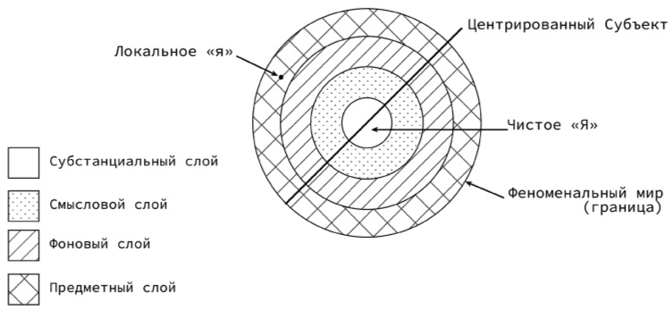 2.2.2. Чистое «Я»25 (в дальнейшем – «Я» или Субъект) достижимо посредством предельной редукции, применяемой к эмпирическому «я». Такое «Я» не может быть сведено ни к каким качествам, а потому – апофатично, «бесплотно» и не локально. Оно тождественно себе и незримо присутствует во всех явлениях психической жизни, свидетельствуя о них. Рефлексивные акты сознания всегда чьи-то и именно «Я» является их «бенефициаром». Каждый акт восприятия есть не просто «восприятие, повисшее в воздухе», но чье-то восприятие. «Я» как бы отражается в cogito и потому может быть обнаружено и познано по таким «отблескам».