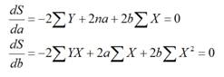 Для отыскания параметров a и b, при которых функция f(a,b) принимает минимальное значение, необходимо найти частные производные по каждому из параметров этой функции a и b и приравнять их нулю. Если минимальную сумму квадратов отклонений (остатков) e2 обозначить через S, то в результате мы получим систему нормальных уравнений МНК для прямой (2.1.2):
