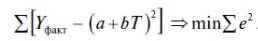 где a – свободный член уравнения регрессии; b – линейной коэффициент регрессии, показывающий, как изменение величины независимой переменной (фактора) T в среднем способствует изменению зависимой переменной (результативного признака) Y; Y расч. – расчетное значение результативного признака, вычисляемое по формуле (2.2).