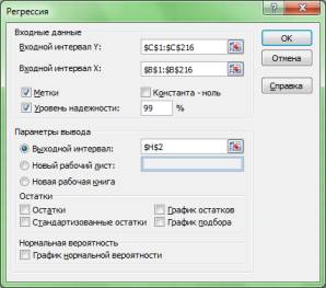 Если бы мы хотели получить уравнение регрессии без свободного члена, который в формуле (2.2) обозначен символом a, то тогда нам следовало бы выбрать еще и опцию КОНСТАНТА-НОЛЬ. Однако в данном случае в использовании этой опции нет необходимости.