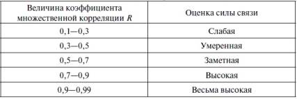 Зная величину коэффициента корреляции R, можно дать качественную оценку силы связи между зависимой и независимыми переменными, включенными в данное уравнение. С целью классификации силы связи обычно используют шкалу Чеддока (см. табл. 2.1).