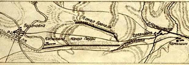 Рис. 5. Город Камышенка и Петр город на карте строительства Волго-Донского канала между Камышенкой и Иловлей