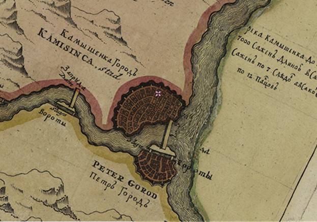 Судя по карте Корнелия Крейса, которая на рис. 5 приводится не полностью (здесь можно увидеть только два проектируемых города – Камышенка и Петр город и два шлюза), в общей сложности строители канала собирались построить шесть шлюзов, двое из которых – в районе современного Петров Вала, а самая последняя – в бухте реки Камышенки, то есть в районе островка, ушедшего под воду после ввода в эксплуатацию в начале 60-х годов XX века Волжской ГЭС.