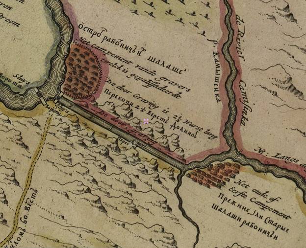 По всей видимости, после упомянутого выше набега кубанских татар руководители строительства решили разбить для рабочих новый лагерь. Судя по карте Корнелия Крейса (см. рис. 6), новый лагерь, в который переместились шалаши строивших канал рабочих, был разбит на левом берегу Иловли, то есть находился в начале трассы канала со стороны этой впадающей в Дон речки. Причем, новый лагерь с трех сторон (за исключением береговой полосы) был окружен частоколом, то есть представлял собою острожек. С помощью сервиса на сайте http://www.etomesto.ru/map автору этих строк удалось определить, что новый лагерь находился вблизи современного Петров Вала.