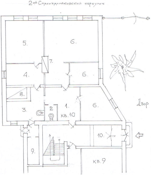 Кв.10: 1 – прихожая, 2 – туалет, 3 – кухня, 4 – комната бабушки, 5 – комната родителей, 6 – комнаты соседей, 7 – печка-голландка, 8 – русская печка, 9 – кладовка, 10 – «парадное» с тамбуром