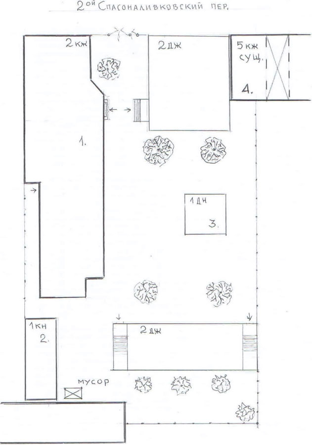Я постарался воспроизвести их по памяти. Сейчас не осталось ни двора, ни нашего дома, ни многих из соседних домов по 2-му Спасоналивковскому переулку… А был он по тем временам неплохим для Замоскворечья – района исторически мещанско-купеческого, с одноэтажной, в основном, деревянной застройкой… Однако наш дом был двухэтажным, из добротного кирпича, с толстыми стенами. Несколько необычный план дома объясняется тем, что архитектор старательно обошел росшее на участке большое дерево – интересный пример бережного отношения к зелени в те времена! Зато в «лихие девяностые» это дерево безжалостно уничтожили вместе с моим домом.